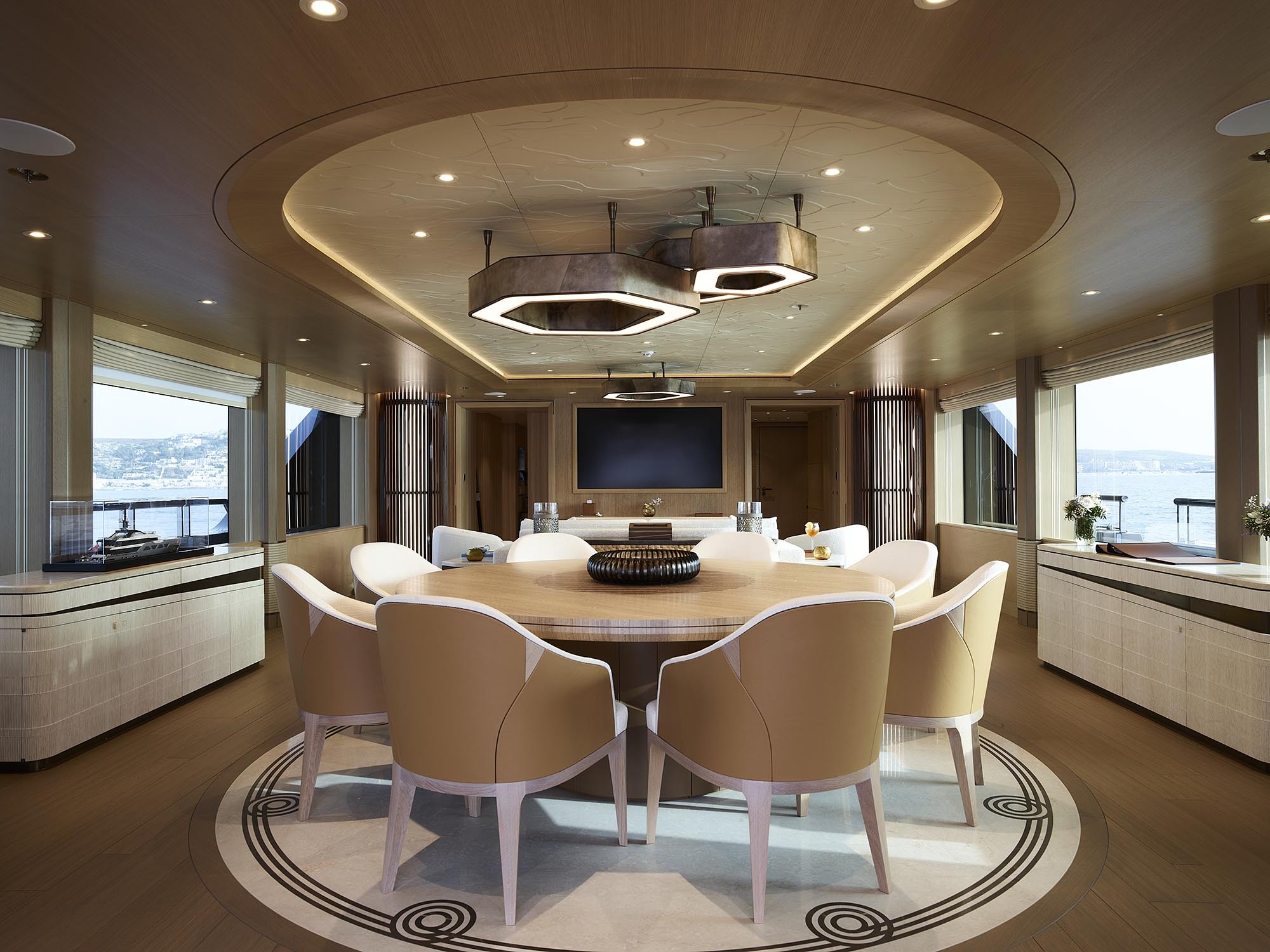 Large, comfortable, custom-designed furniture in the main salon again hints towards the unique exterior styling and the cleverly designed dining table expands to host twelve guests, seated beneath a textural ceiling dome whose pattern evokes the reflections of light on the water.