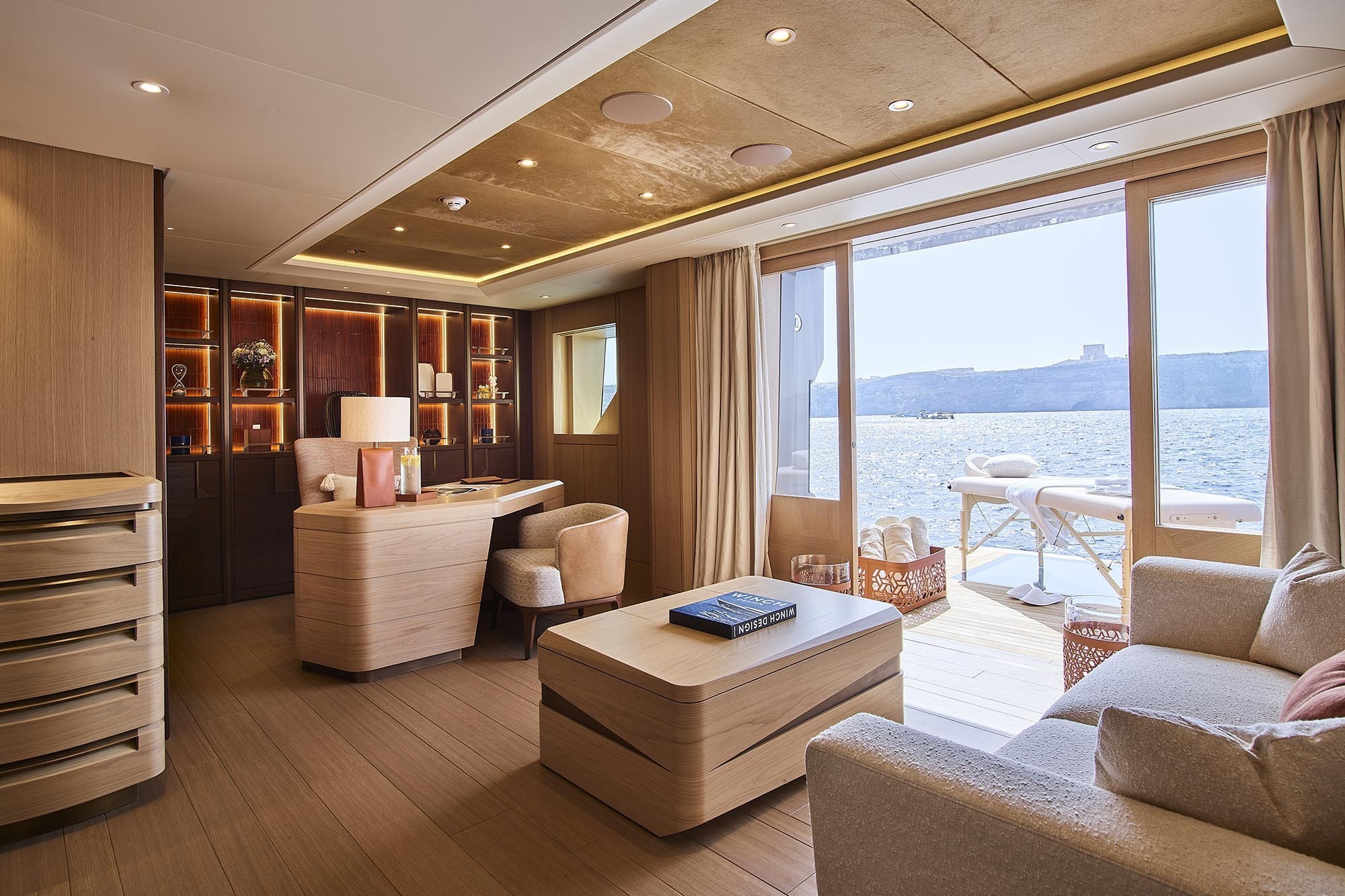The relaxed and natural interior theme, with a subtle masculine edge blends perfectly with the yacht’s more angular and geometric exterior. Faceted and chamfered forms in the furniture echo the unique signature of the Espen Øino penned exterior design. Rather than dominant design statements, there is a deliberate harmony throughout the spaces to promote a tranquil atmosphere. This is further emphasised through the choice of finishes; light bleached oaks, open-grain veneers, foot-worn timber floors, brushed bronze metals and woven linen fabrics combined with natural animal hides and a careful selection of stones.