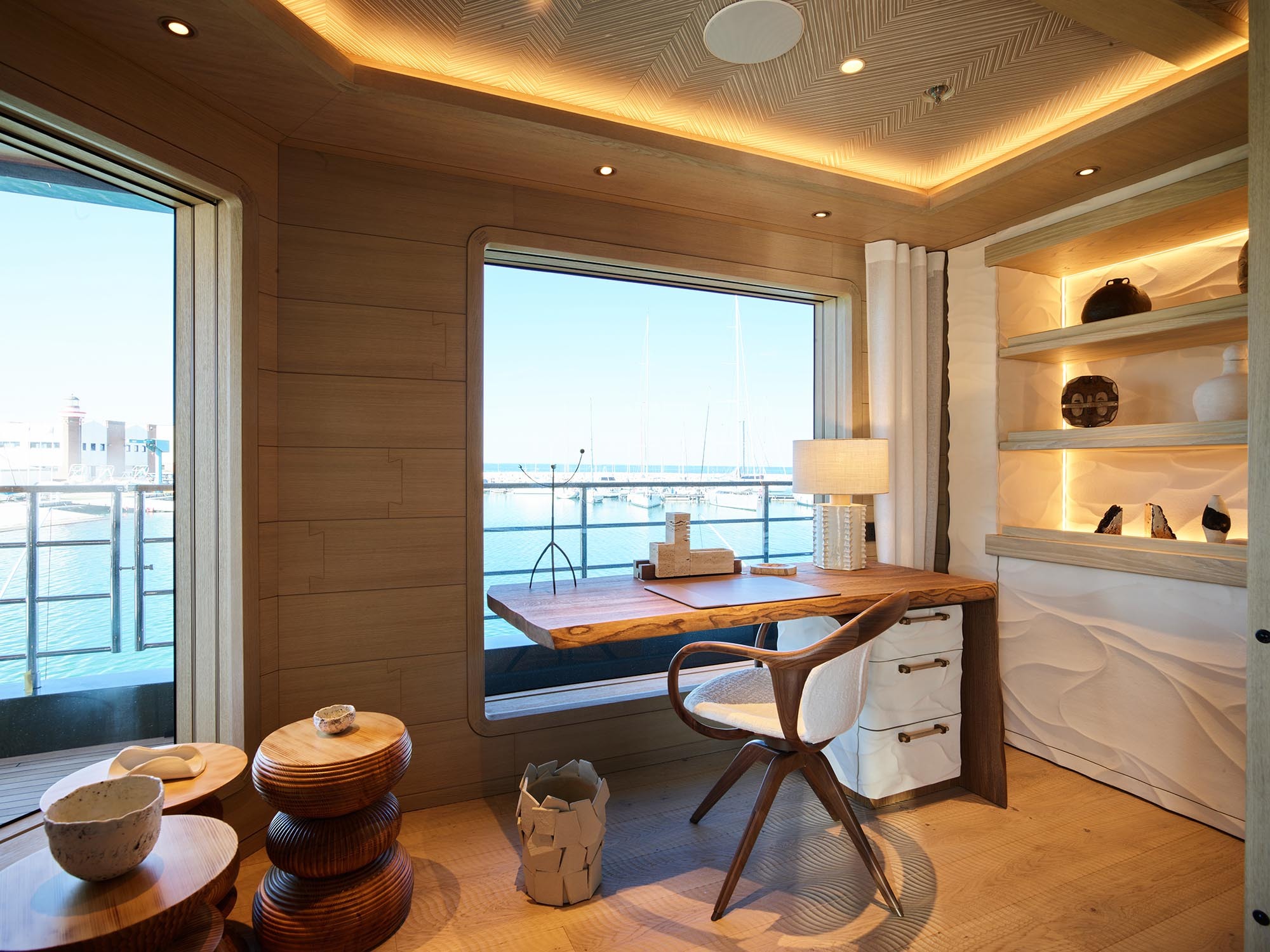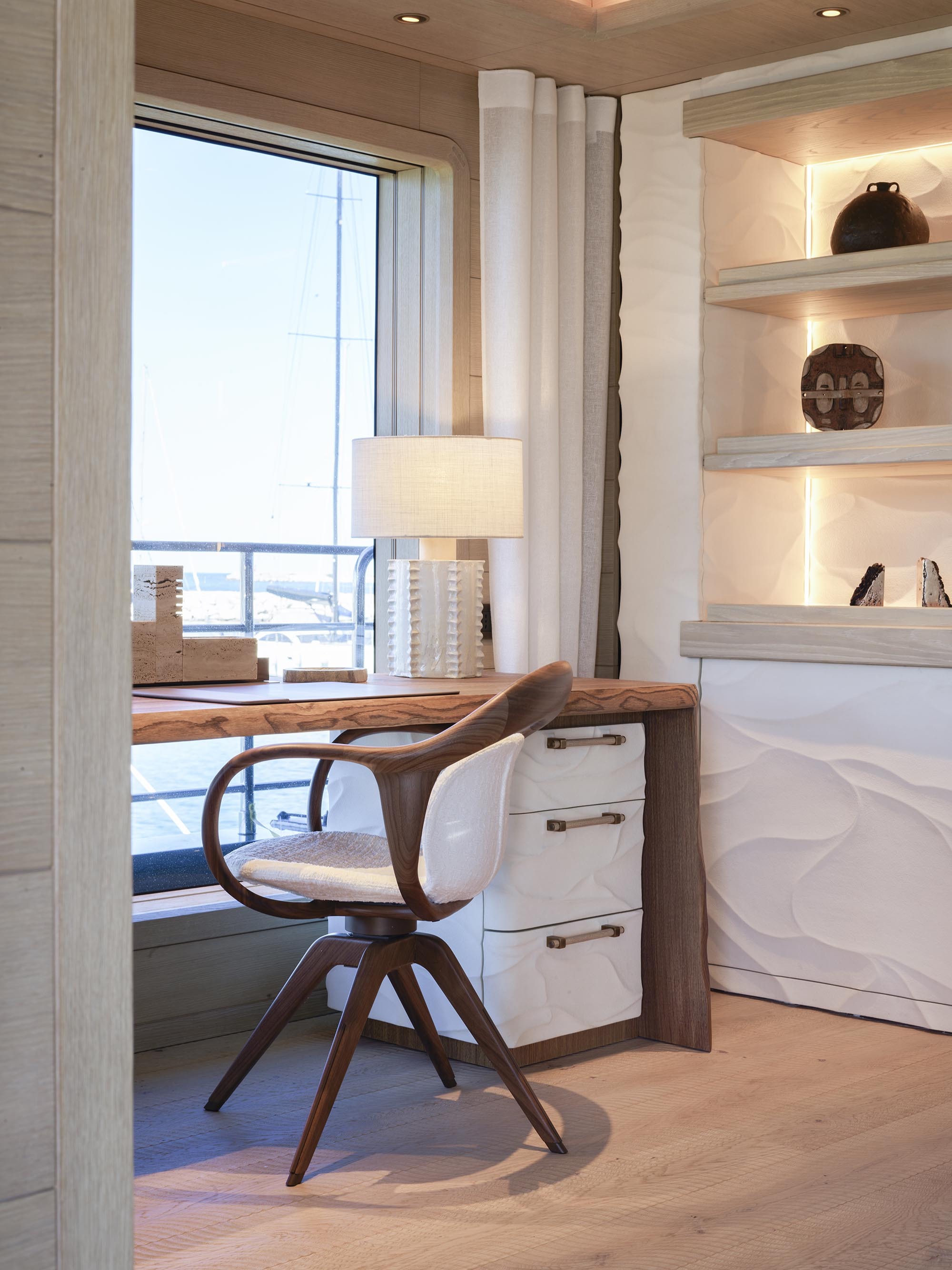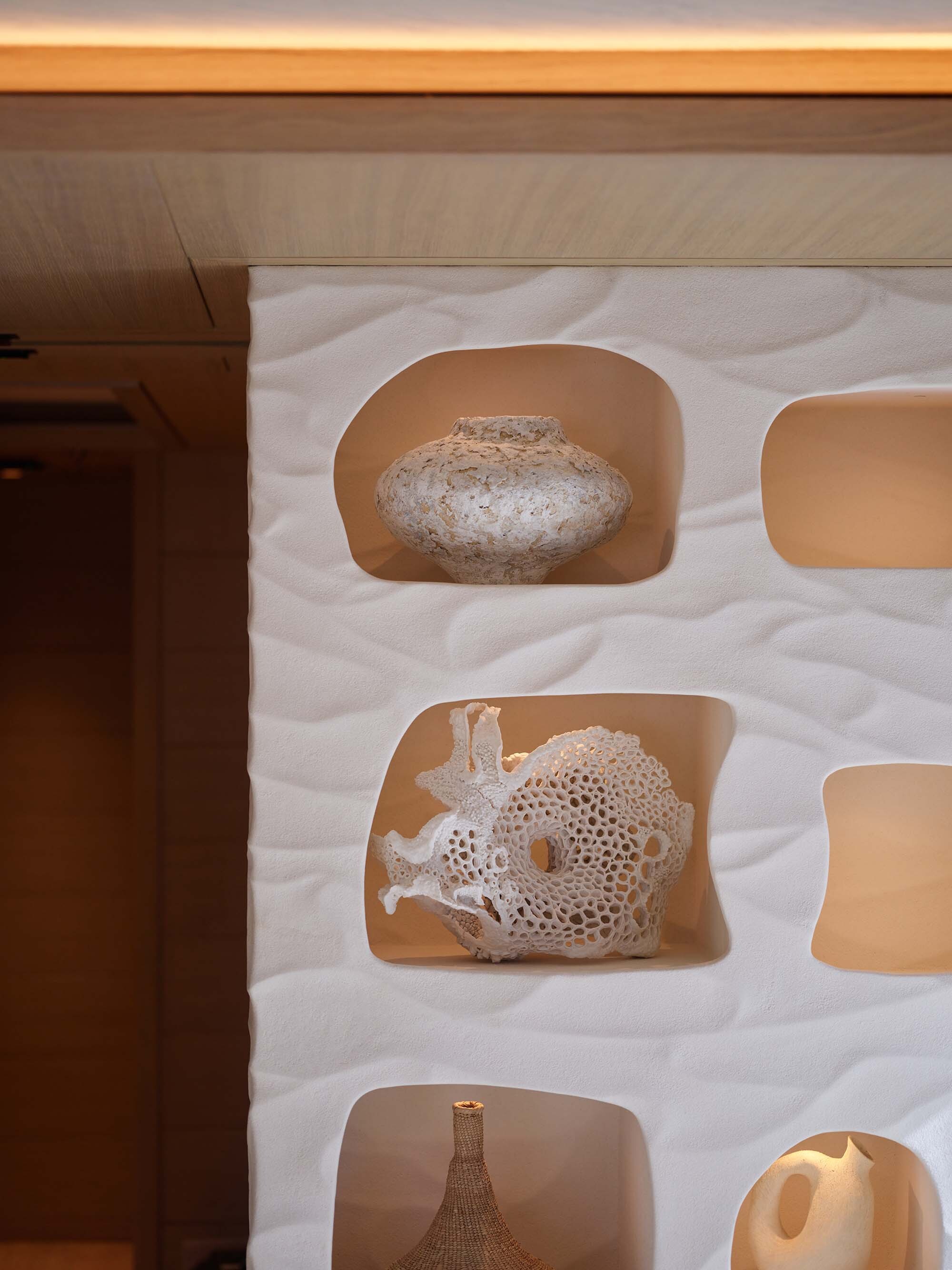 Wooden flooring has been milled to incorporate a 3D wave pattern inspired by the sensation of walking barefoot across ocean sand, designed to gently massage the feet and provide a sense of physical grounding as you move around the interior. Carpets are 100% wool, hand-loomed in Sardinia and dyed using natural pigments.