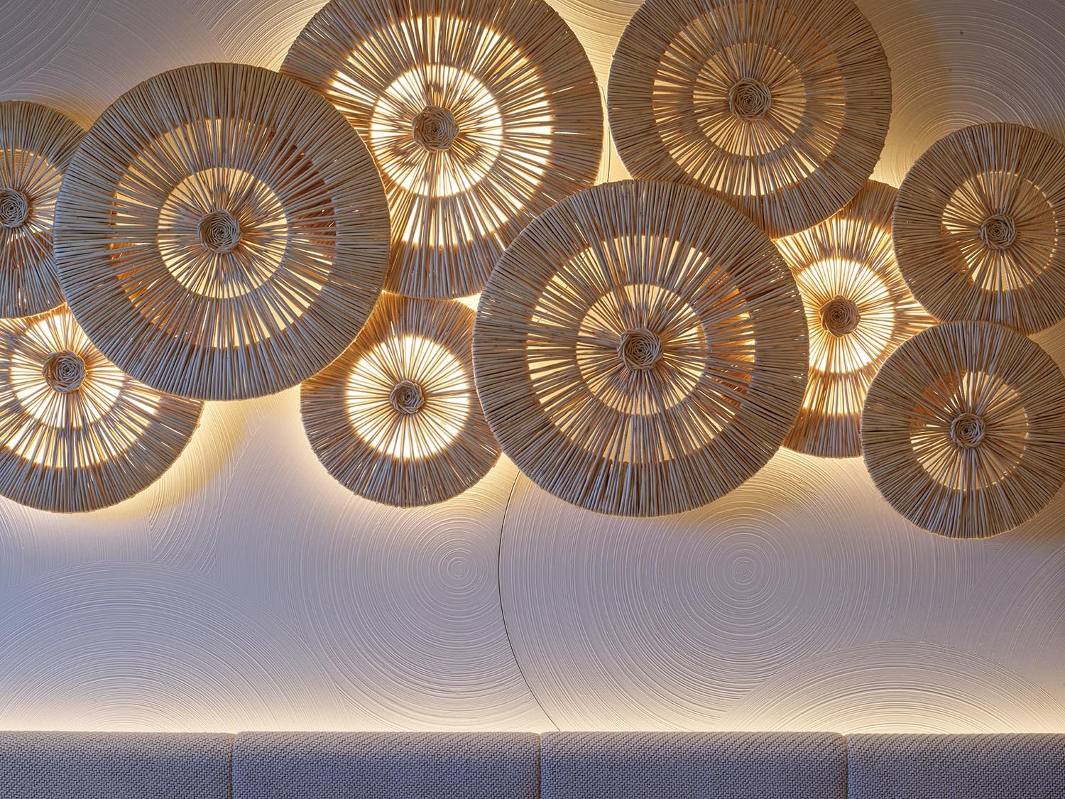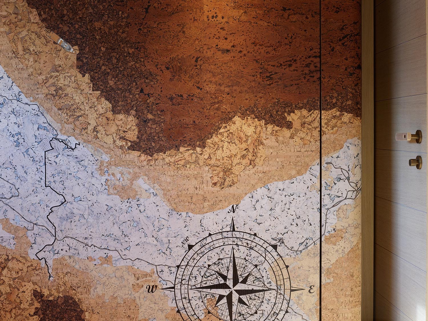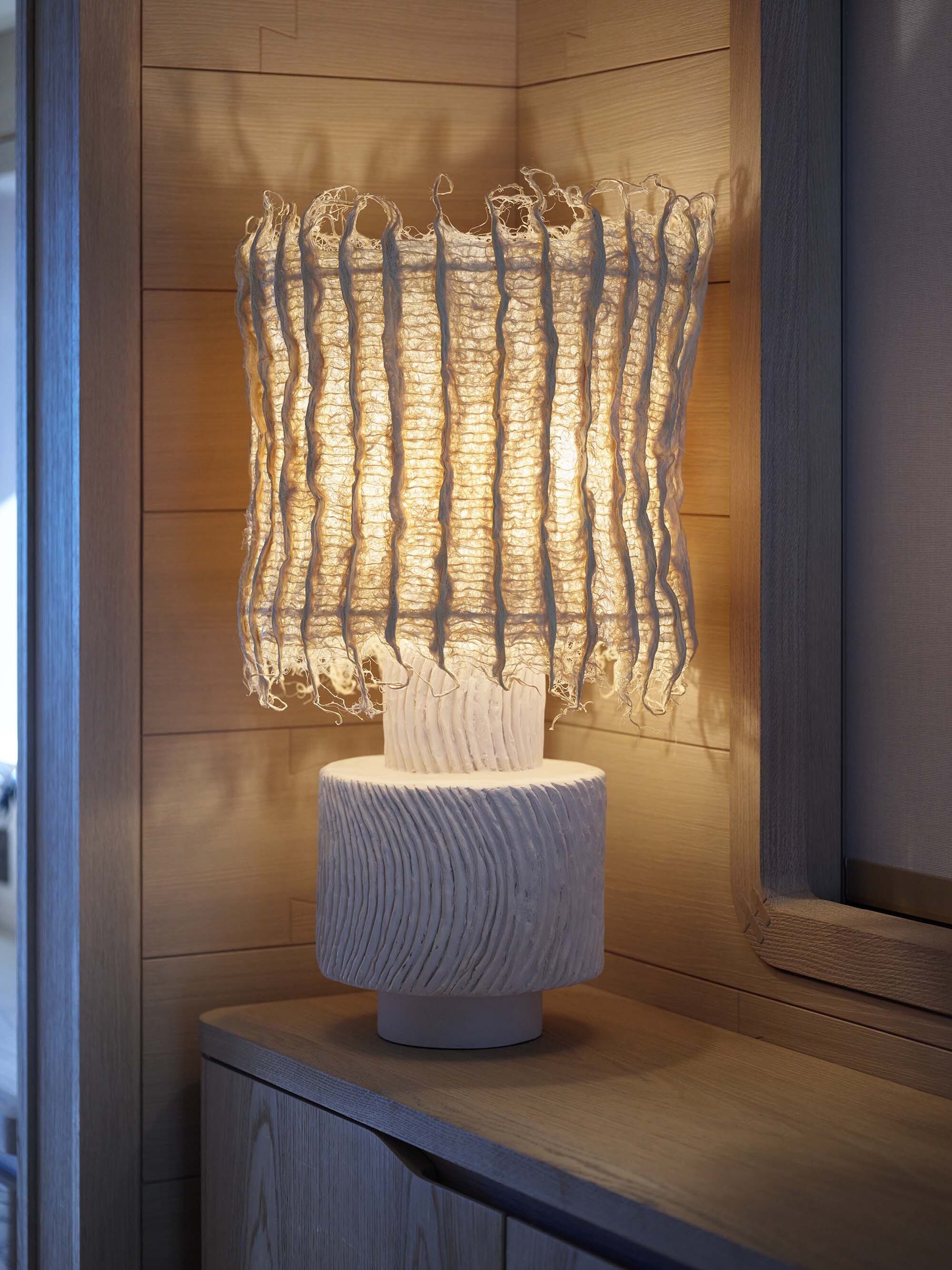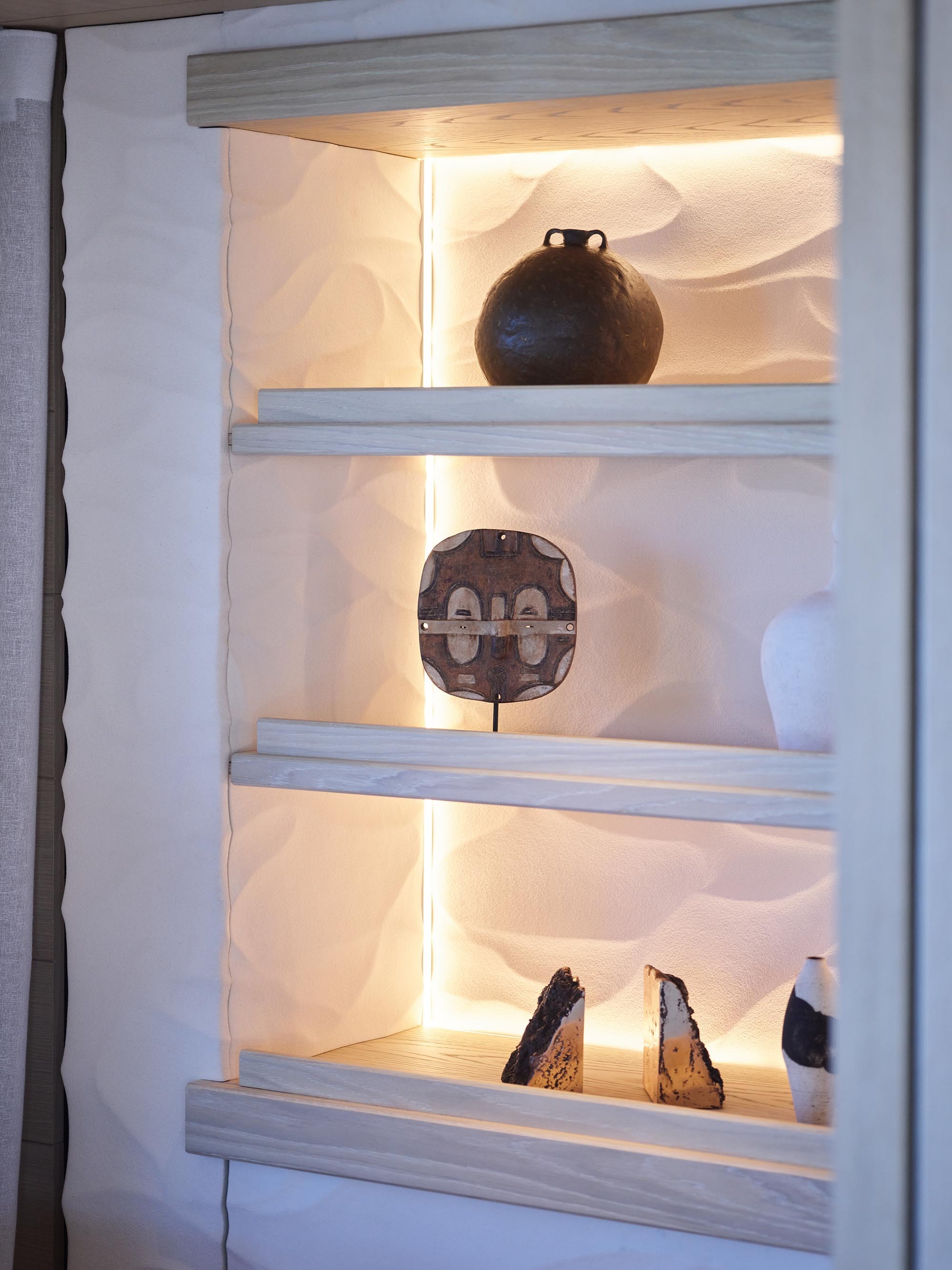 Wooden flooring has been milled to incorporate a 3D wave pattern inspired by the sensation of walking barefoot across ocean sand, designed to gently massage the feet and provide a sense of physical grounding as you move around the interior. Carpets are 100% wool, hand-loomed in Sardinia and dyed using natural pigments.