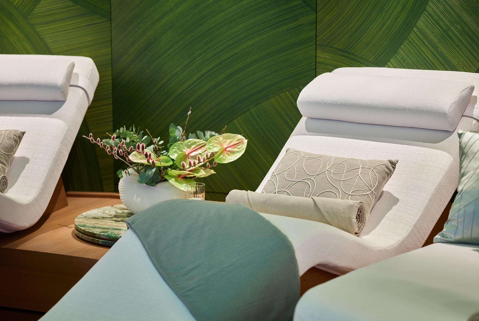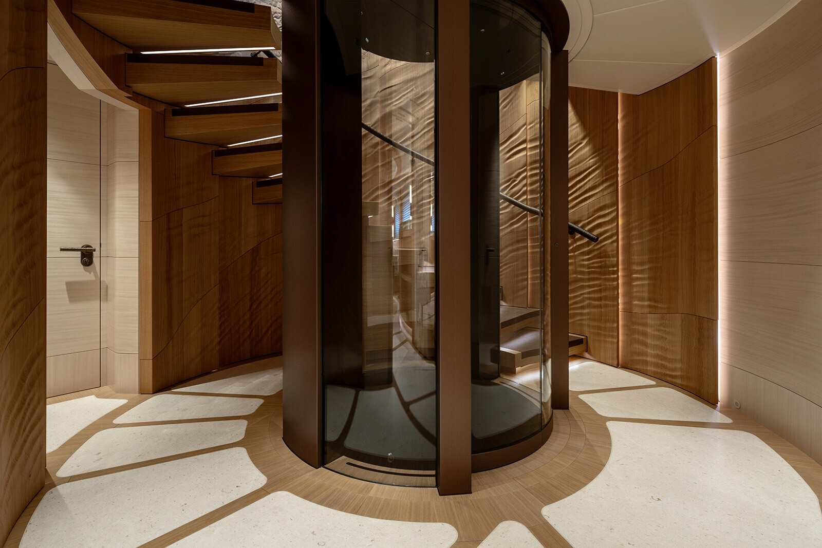 Perhaps the greatest unifying element of all is the oak staircase. The staircase is carved in three different ways to tie the earth, water and air elements into one rather than letting them be seen in isolation. The staircase curves upwards to invite guests between three decks, while vertical lighting brings it to life. Like all the best art, its unique beauty makes travellers want to reach out and touch it. A glass elevator also speeds between the lower deck, main deck and owners’ deck. The entire space is enveloped with milled oakwood panels.