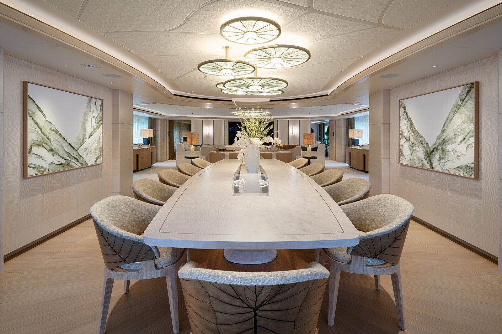Nowhere is the custom design more evident than in the main deck salon. An 11.5m beam promises space and grace. The fine dining area channels the private dining room of The Connaught in London. The earth theme includes dining chairs upholstered in palm leaves. Plus a centre stage coffee table crafted from an ancient oak trunk.