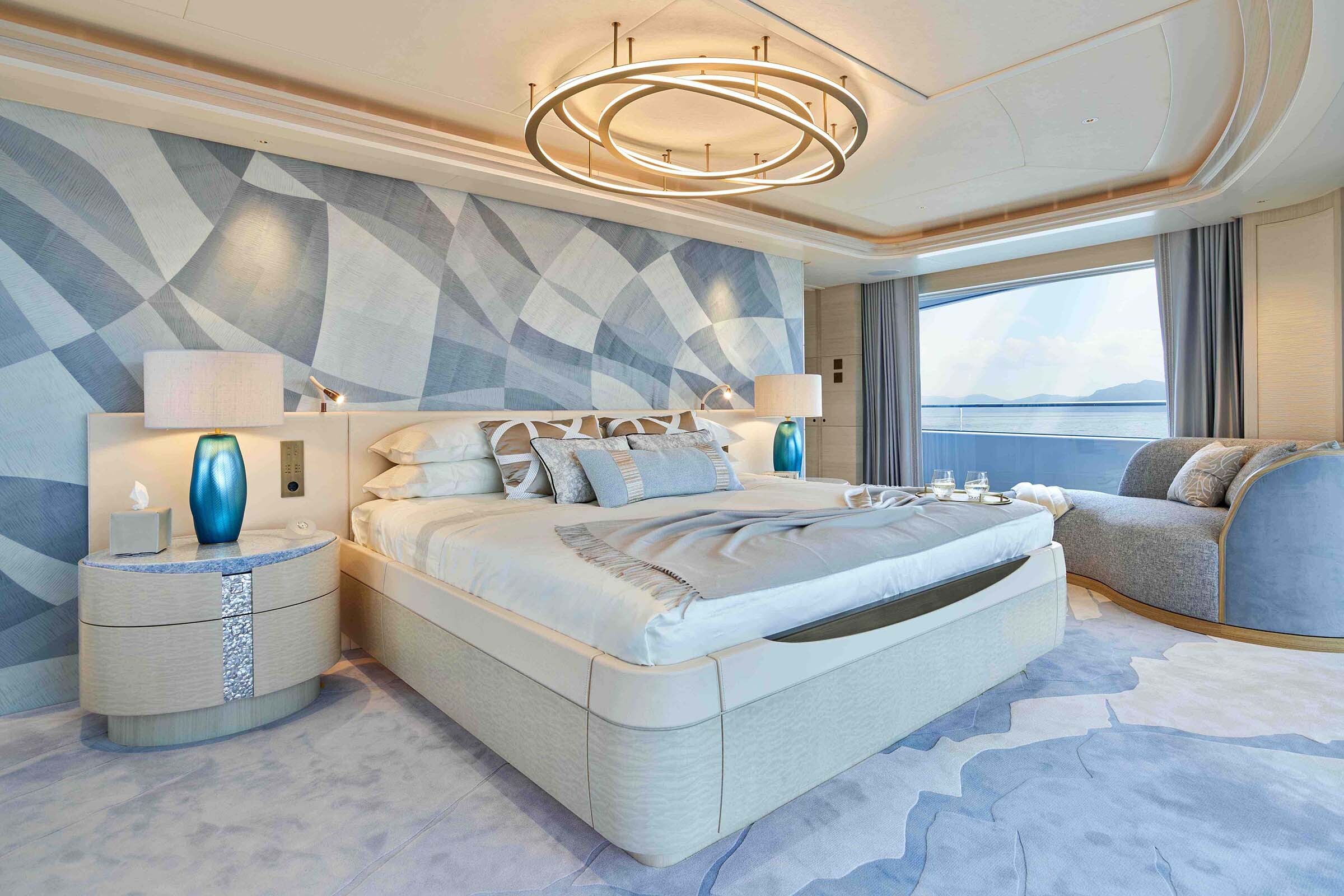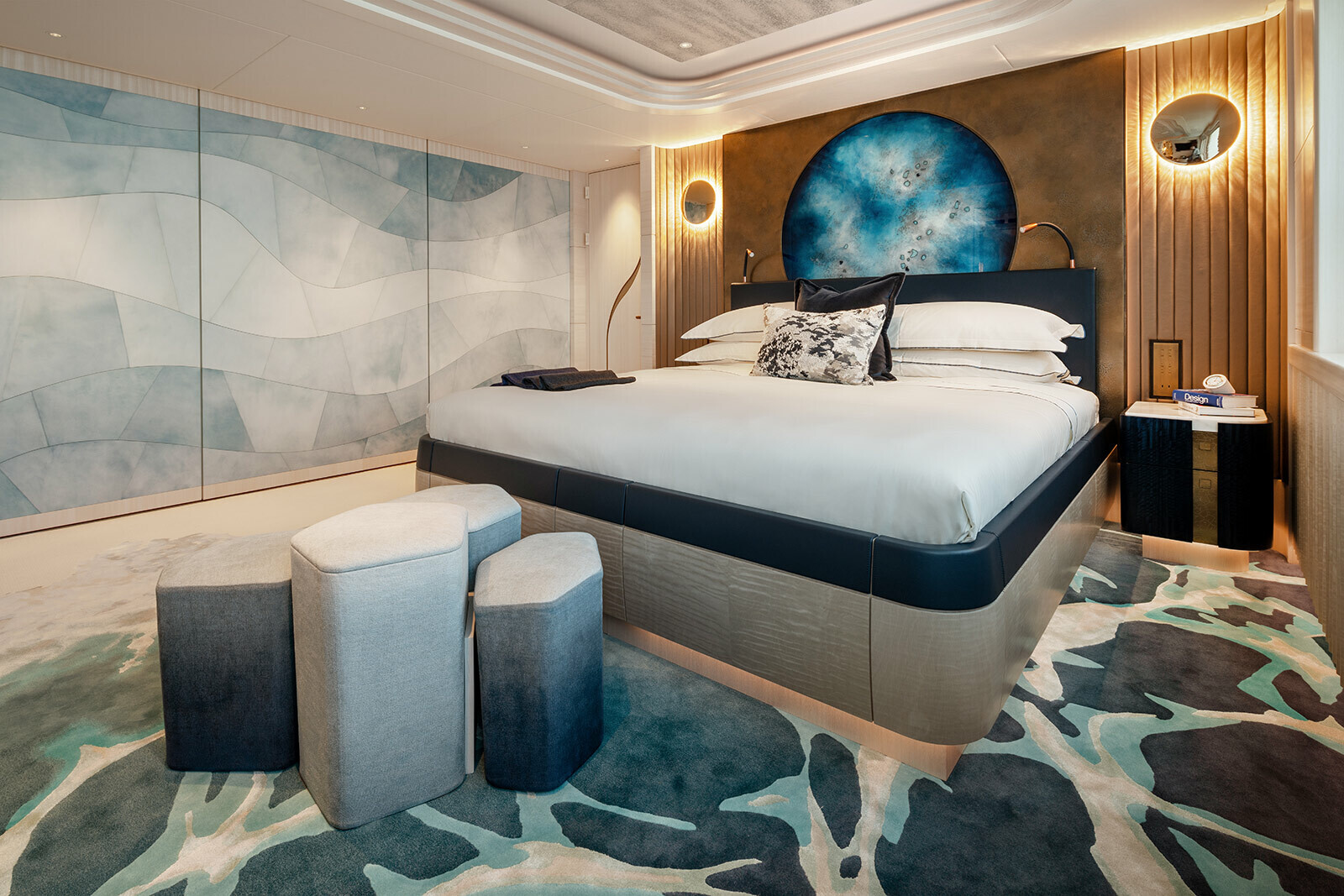 The air element breezes through the upper deck. The master suite aft is shaded sky blue with mother-of-pearl inlays reflecting the sunlight. At 56 square metres, with a generous bathroom and shower, the space is more like an apartment than a suite. The private owners’ deck aft is accessed by sliding doors. By contrast, the upper deck forward owners’ suite is even more spacious and exuberant. An actual representation of the solar system is inlaid into the metallic headboard, allowing guests to run their fingers over the cosmos. Full length windows filter sunlight around the 62 square metre space.