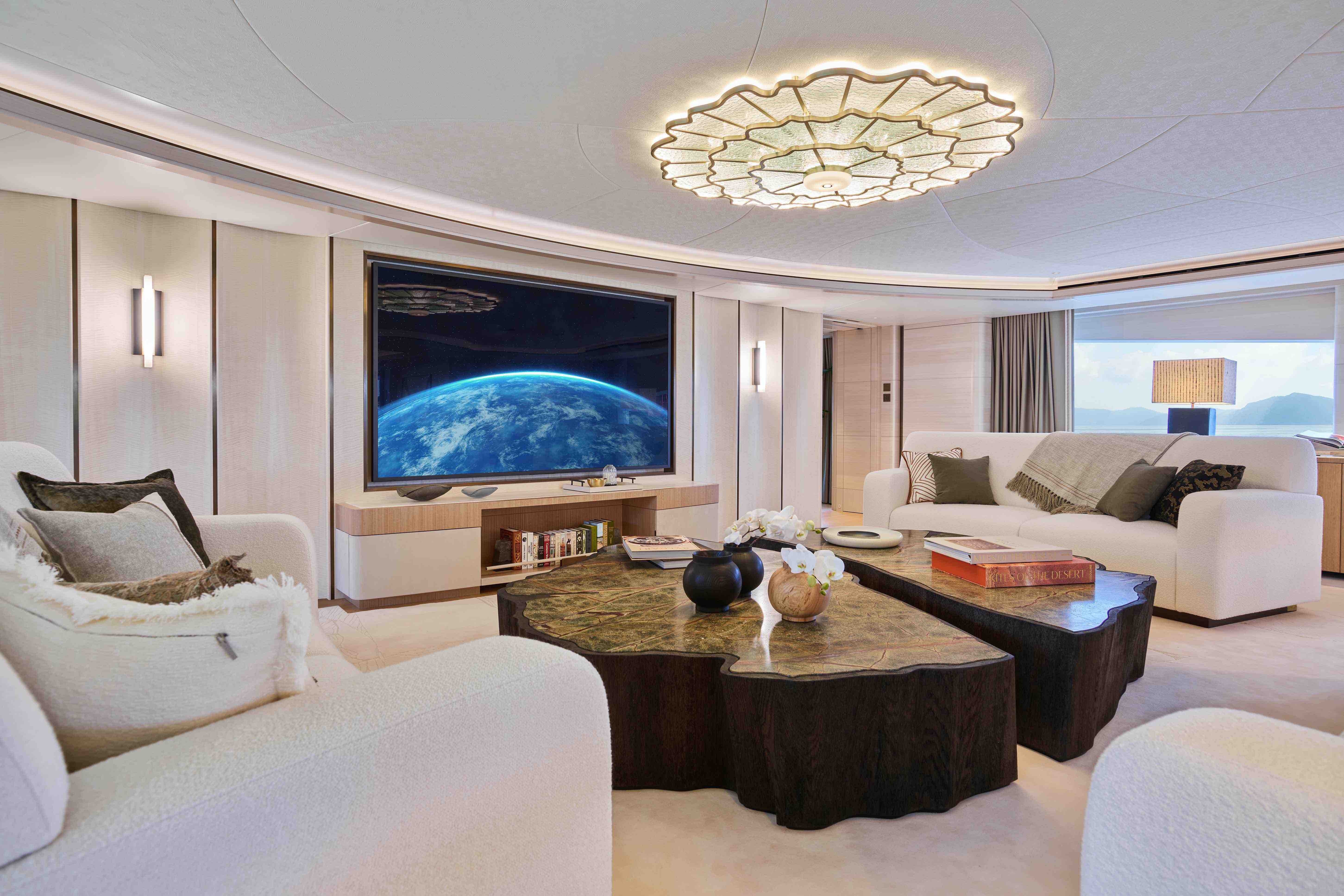 Just outside, on the private owners’ deck, both generations can stargaze while relaxing on a vast Ottoman recliner. Alternatively, a film of choice can be streamed on the outdoor cinema screen on the foredeck.