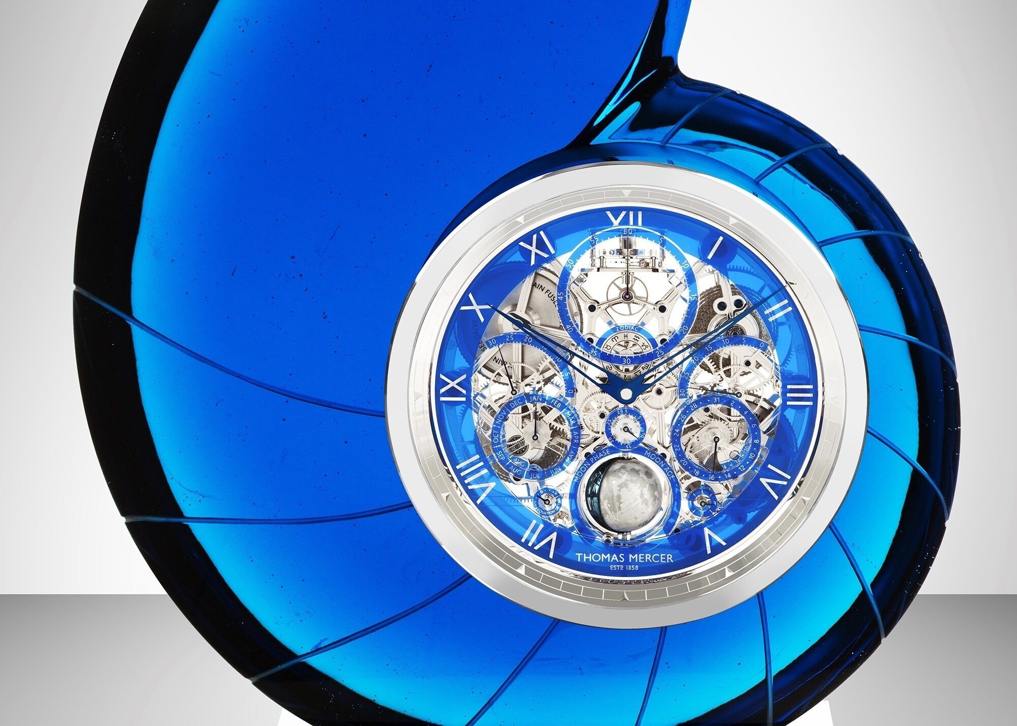 The Nautilus, which you can see above and to the left. It is a timekeeper that epitomizes the concept of horological sculpture and blends the respective arts of interior design, marine chronometry and crystal making into a truly unique piece. Directly above is Chelys, our latest collaboration together with Marmor Hotavlje.