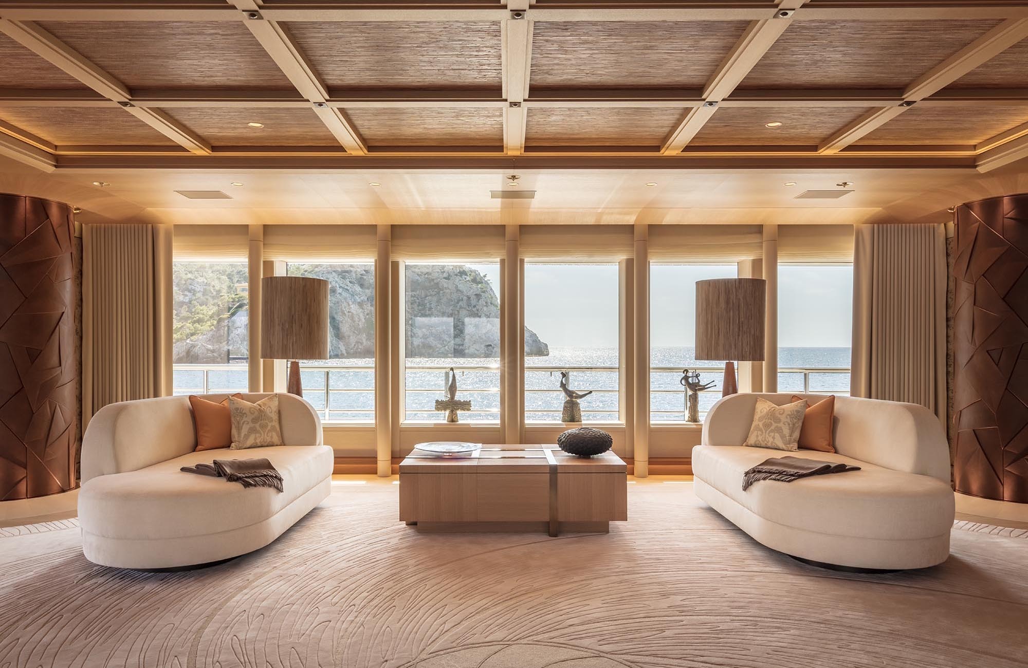 The Amels Limited Edition 272 Here Comes the Sun is the largest in the Limited Edition range. Winch Design was responsible for her natural, warm and relaxed interior. A palette of warm browns, cream fabrics, gold-toned lighting, bronze panels with a brushed finish, antiqued patina and furniture in curving shapes provide a calm, beachy feel and a relaxed atmosphere.
