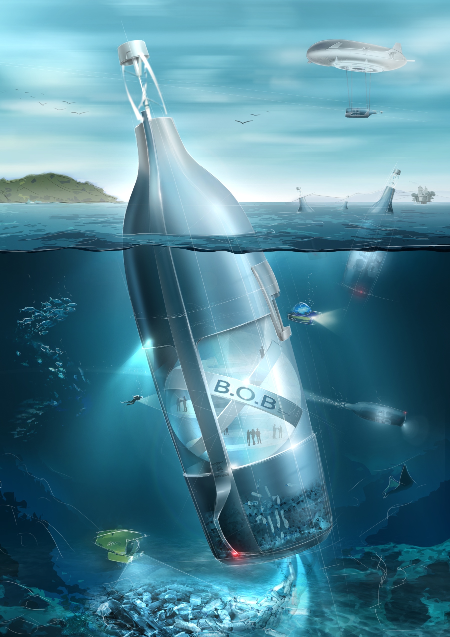 B.O.B (Bio Observation Bottle) is an oceanographic marine research pod. Its bottle shaped hull symbolises the plastic litter in the water, whilst the spherical interior embodies Earth and the need to protect it.