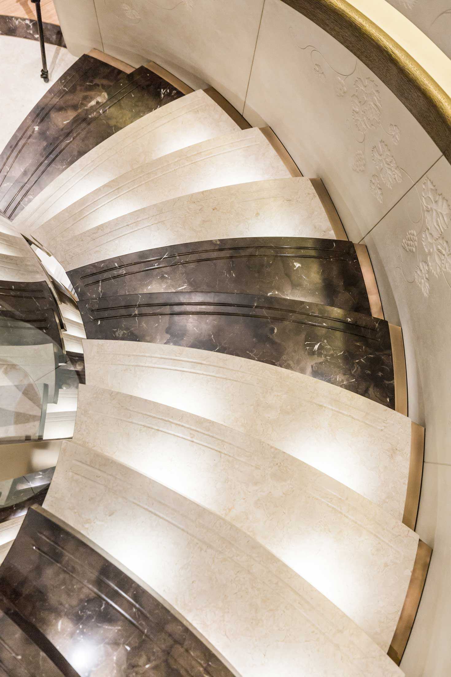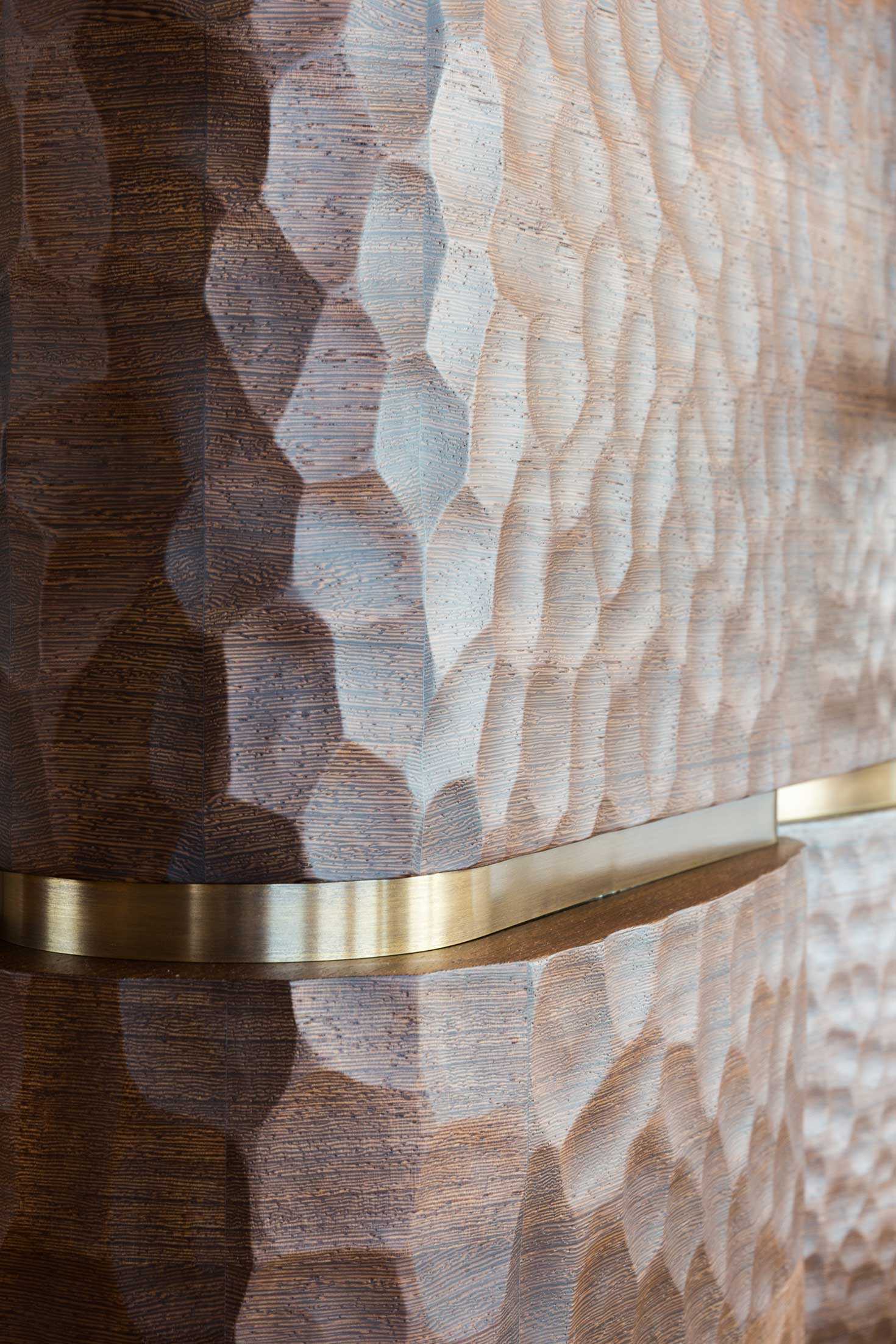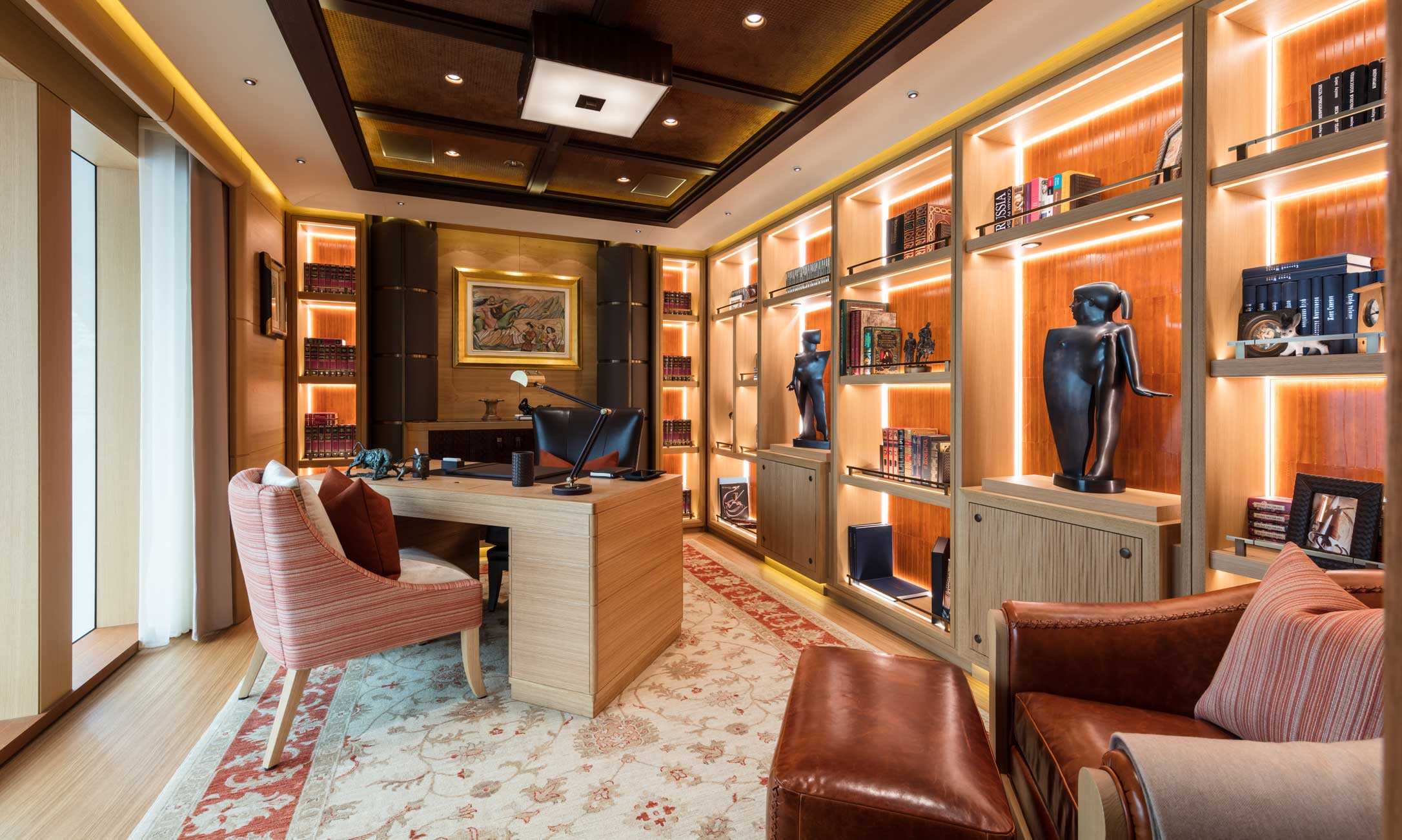 Winch Design responded with a palette of warm browns, cream fabrics, gold-toned lighting, bronze panels with a brushed finish, antiqued patina, and furniture in curving shapes. Rather than glossy, this decorative scheme is tactile, with carved silk and wool carpets, mottled leathers, natural oak panelling and smooth “footworn” floors.