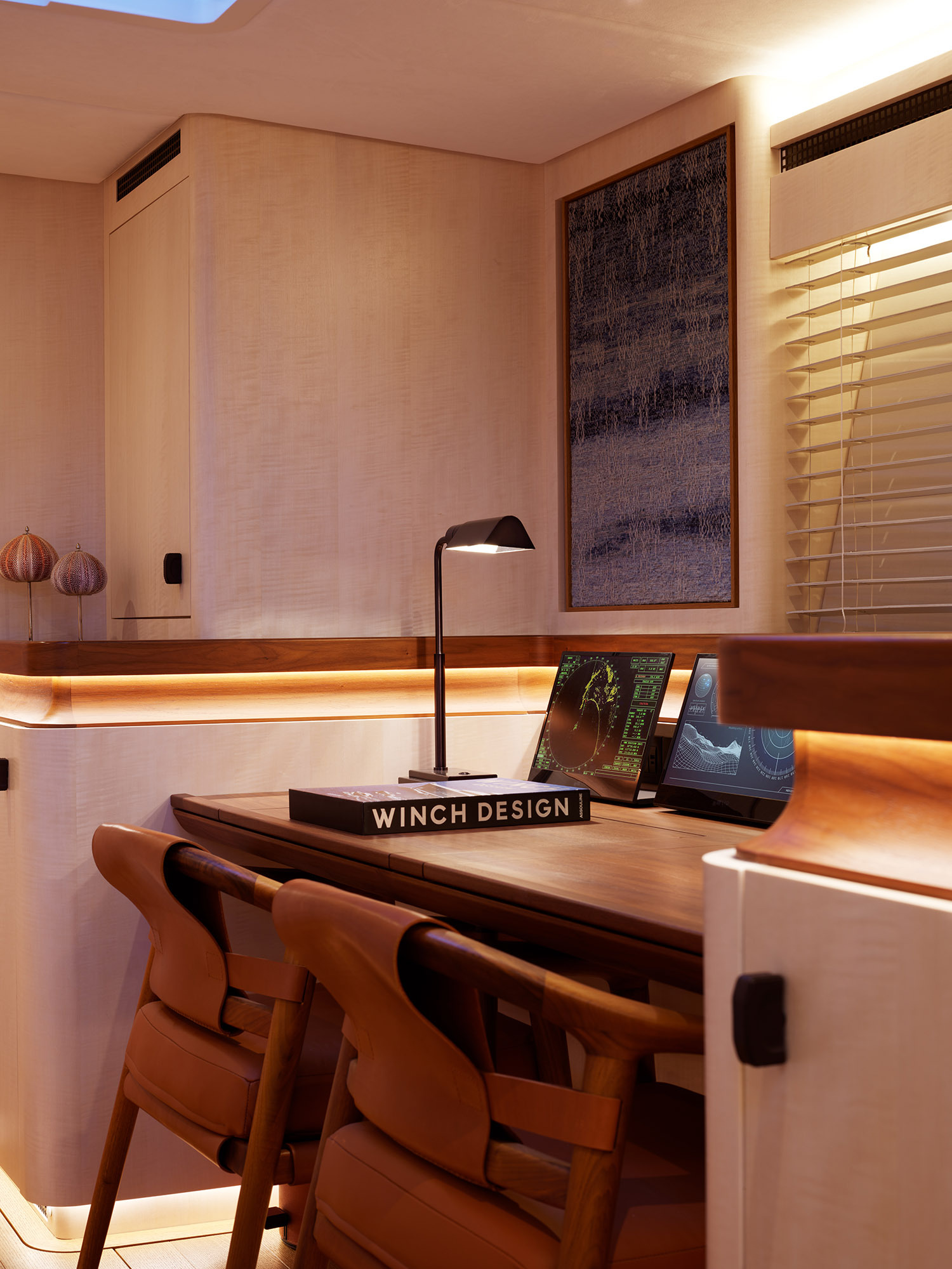 combining cream, tan and dark brown leathers with navy blues, limed oak and teak flooring, and subtle rope detailing. These references to traditional maritime design are reinterpreted with a contemporary softness - matte and sateen finishes dominate, avoiding gloss and synthetic sheen in favour of tactile, natural surfaces. Timber is left exposed and celebrated, with veneer-clad walls creating a warm, natural aesthetic throughout. In the salon, the mast is thoughtfully incorporated into the design, wrapped in textured leather from the Winch Design / Foglizzo range and embossed with a subtle rope pattern.