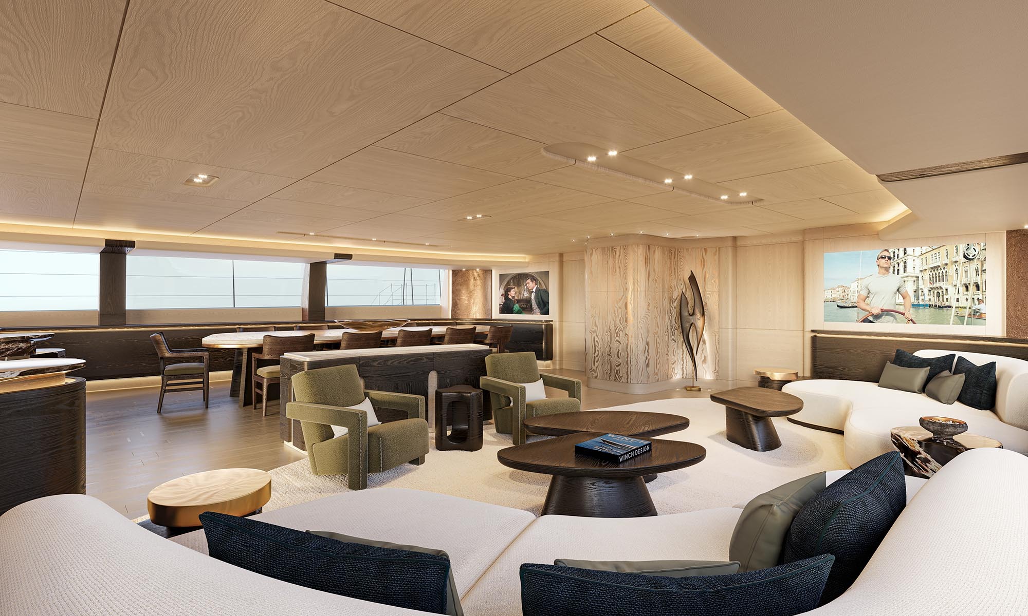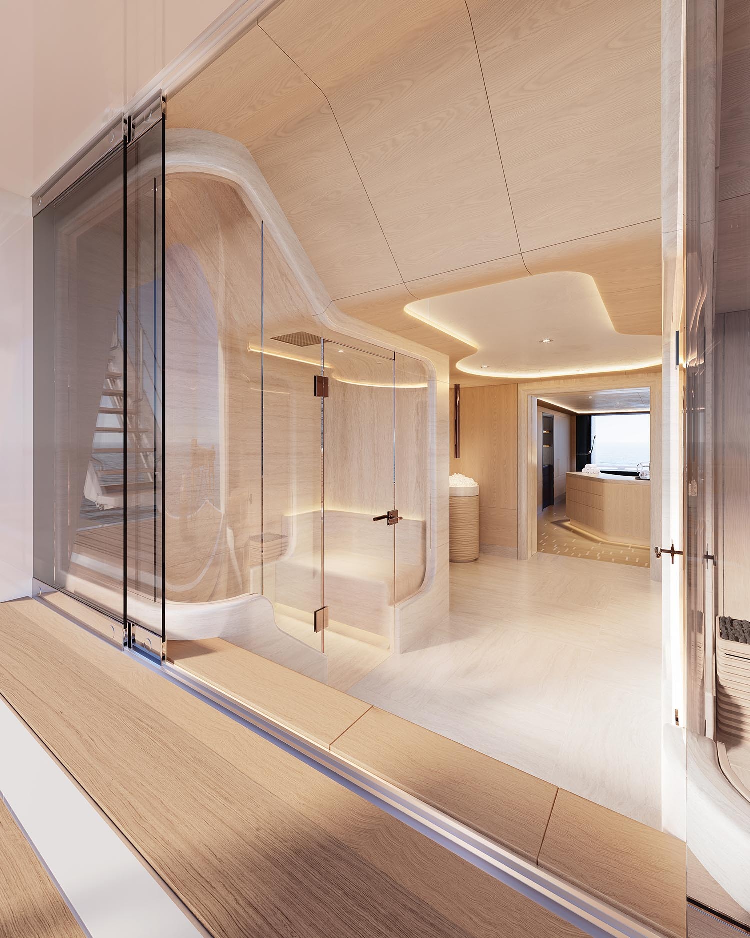 Wellness and relaxation are central to the onboard experience. The midship spa, complete with sauna, steam room, and a folding platform that opens directly to the ocean offers a soothing sanctuary for reflection after an active day. Connected seamlessly to the watersports embarkation lounge, the spa and watersports centre form an oasis for both adventure and tranquillity.