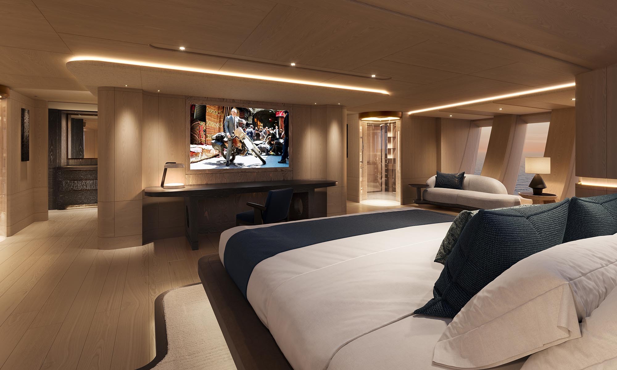 At the heart of the yacht, the full-beam owner’s stateroom is a serene retreat offering direct access to the expansive aft beach deck. Flooded with natural light from full-height windows, this private suite features a raised bed positioned for panoramic ocean views, complemented by a tranquil palette of rich yet calming tones.