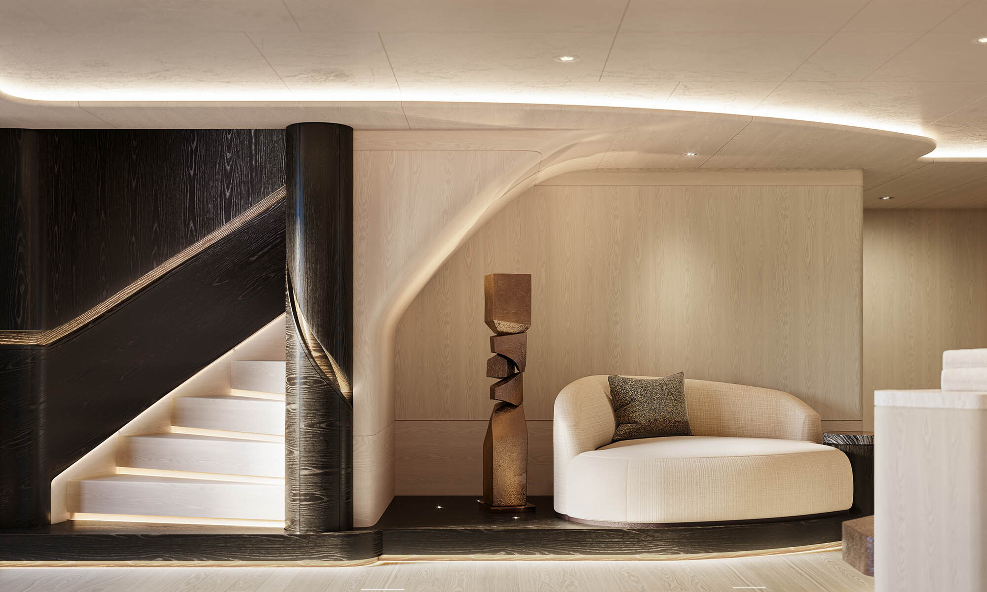 The interior of Sky is inspired by the beauty and balance of nature and accommodates up to 12 guests in refined comfort. Designed as a serene sanctuary at sea, the interior features clean, sculptural lines, natural textures, and calm palettes enhanced by subtle artisan detailing. Every element blurs the boundaries between inside and out, evoking coastal landscapes through an elevated, architectural lens.